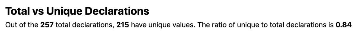 You probably all know @CssStats (if not, visit cssstats.com/)! You probably also know that #CSS declaration repetition is an indicator for CSS #maintainability. (If not, note meiert.com/en/blog/70-percent-css-repetition/.) CSS Stats now shows the ratio of unique/total declarations. Yes! 🚀